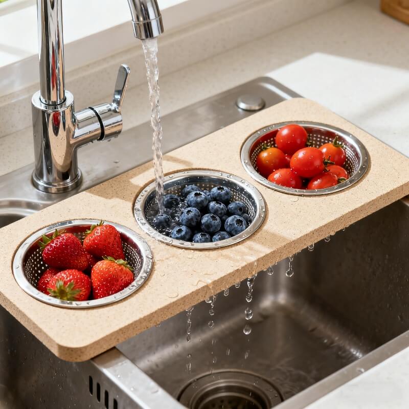 This antibacterial wood fiber sink board features drain holes and a colander. It’s perfect for washing, straining, and food prep right over the sink, saving space and counter mess. Ideal for compact kitchens.